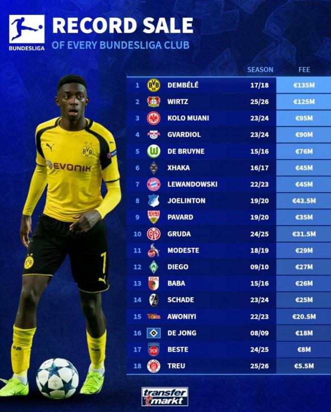德甲轉(zhuǎn)會紀錄:登貝萊領(lǐng)跑,維爾茨次之